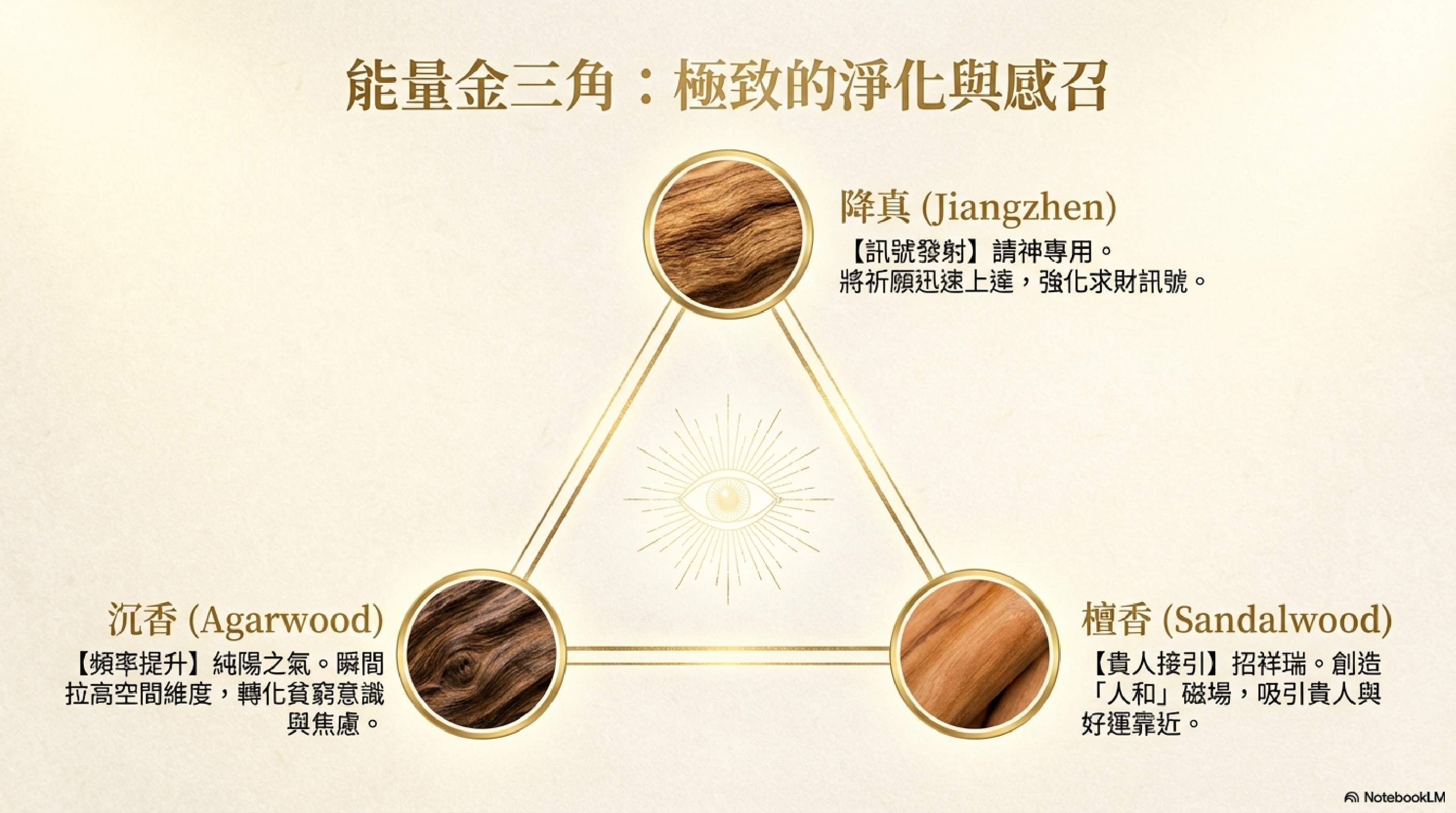 靈性功效: 純陽之氣。在元寶香燃燒時,沉香能迅速拉高空間頻率,將低頻的負能量(如貧窮意識、焦慮)轉化掉。