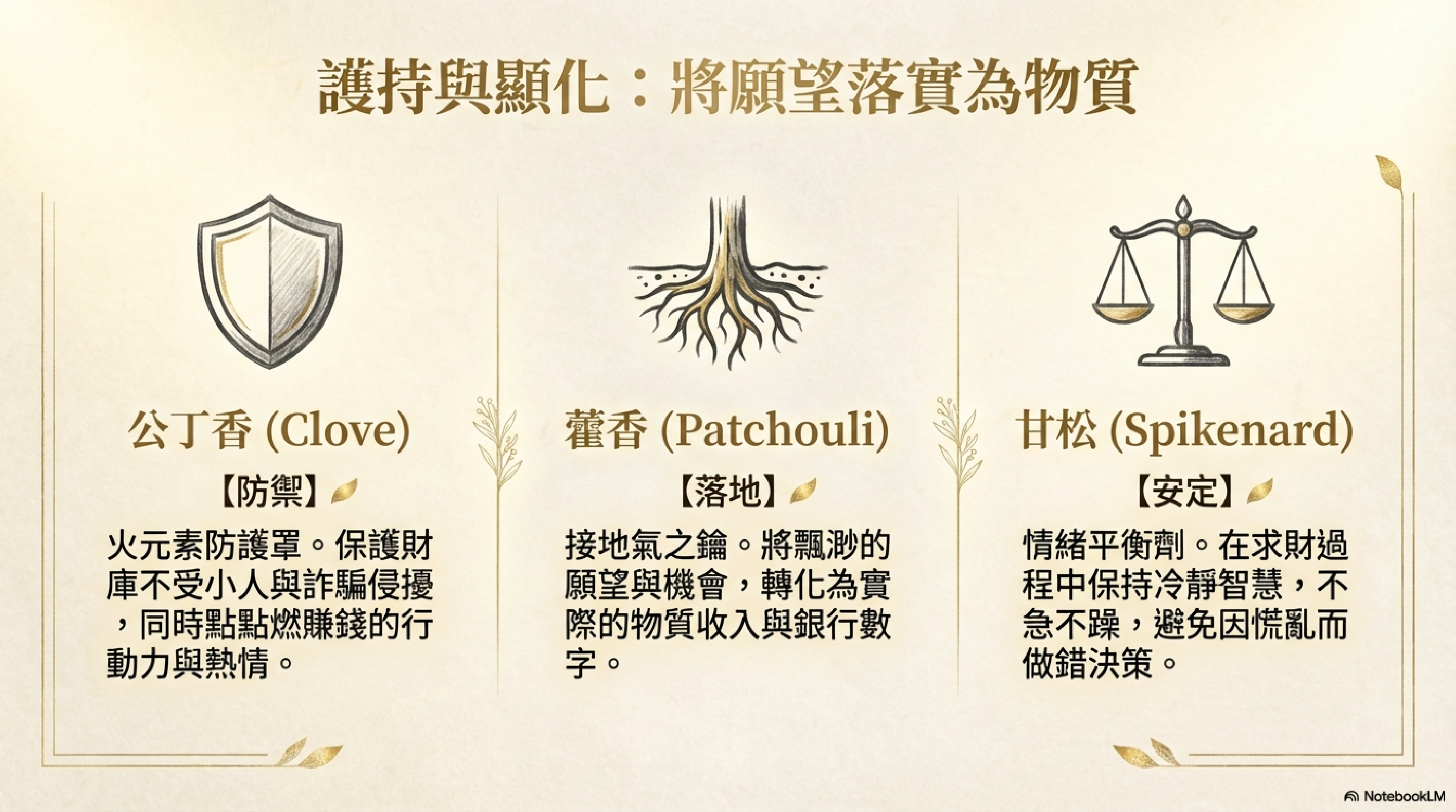 靈性功效: 平衡情緒。在濃郁的木質香氣中,甘松起到安撫作用,讓人在求財時保持冷靜,不急不躁。