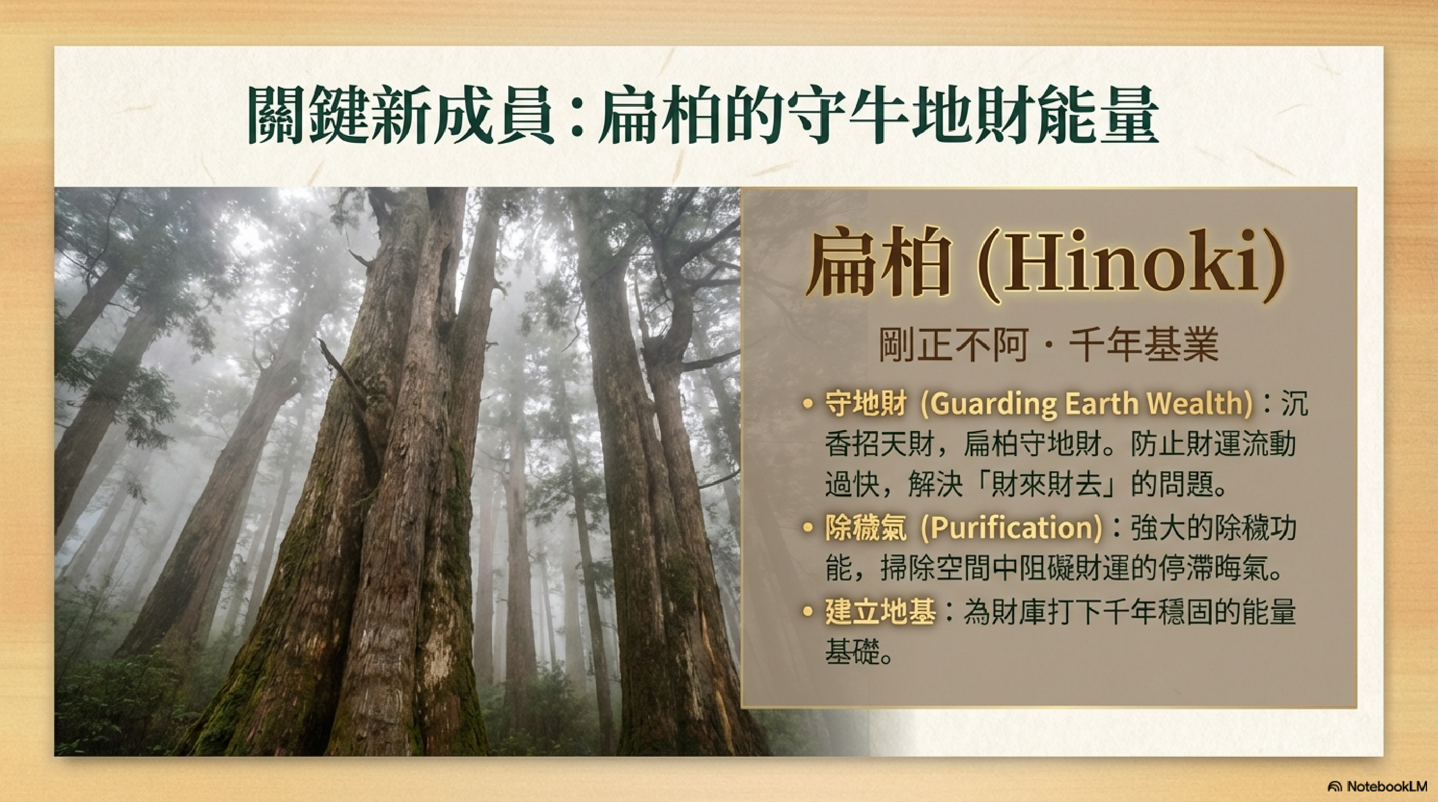 靈性功效: 扁柏(或是檜木類)在靈性上代表「剛正不阿的正氣」與「千年穩固的基業」。它生長在高山,吸取日月精華,能量非常厚實穩定。