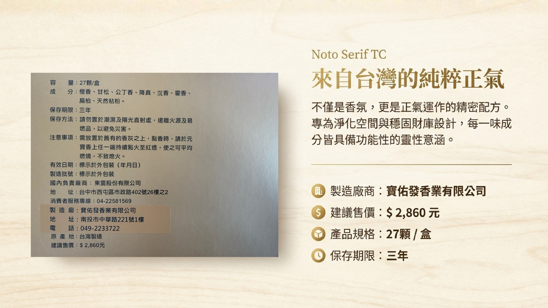 它的成分去掉了較為瑣碎的草本藥材(如甘草、茯苓、肉桂等),保留了核心的高級香材,並加入了一味關鍵的新成分——扁柏。